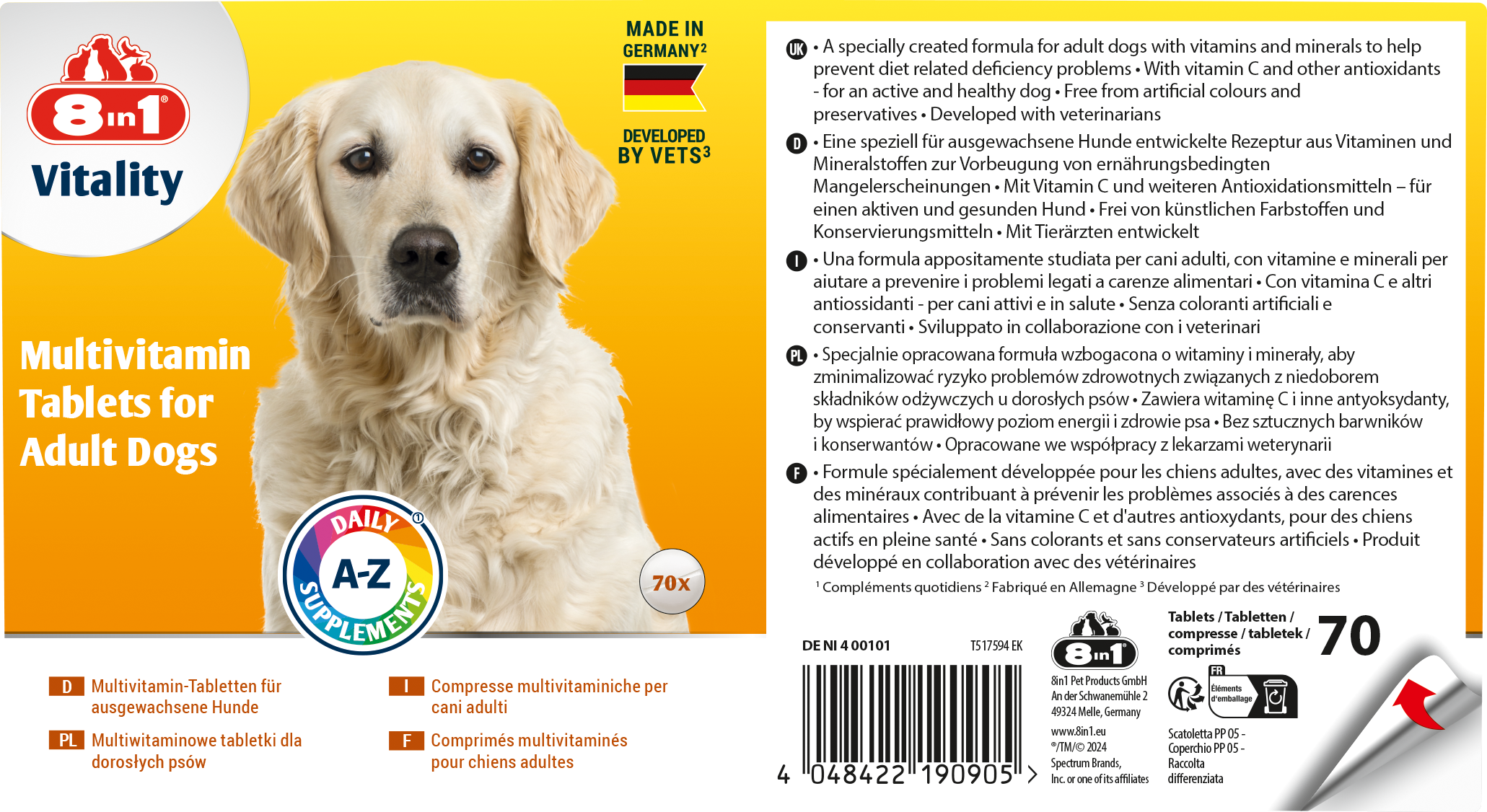 8in1 multivitamīnu tabletes pieaugušiem suņiem ir ideāls ikdienas uztura papildinājums jūsu sunimSastāvs: raugi, augu izcelsmes atvasinājumi, minerālvielas, eļļas un tauki, piens un piena produkti, dažādi cukuri.Analītiskais sastāvs: olbaltumvielas 26%, tauku saturs 7%, kopšķiedra 0,5%, koppelni 15%, mitrums 8%.Piedevas: (/kg), vitamīni: A vitamīns: 400 000 IU, D3 vitamīns: 40 000 IU, E vitamīns: 800 mg, B1 vitamīns: 315 mg, B2 vitamīns: 3200 mg, B6 vitamīns: 32 mg, B12 vitamīns: 74 μg, C vitamīns: 900 mg, niacīnamīds: 3835 mg. Mikroelementi: dzelzs (dzelzs (II) karbonāts (siderīts)): 366 mg, cinks (cinka oksīds): 565 mg, varš (vara (II) sulfāta pentahidrāts): 14 mg, mangāns (mangāna sulfāta monohidrāts): 25 mg, jods (kālija jodīds): 21 mg.